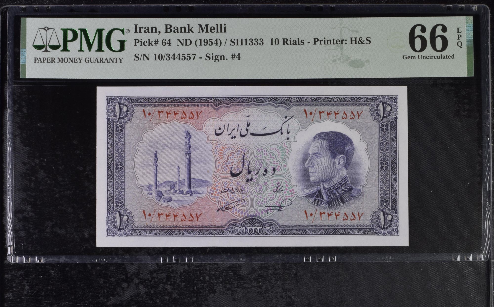 10 Rials Shah Pahlavi, Tomb of Ibn Sina in Hamdan, 1954 PMG 66 Gem UNC (557)