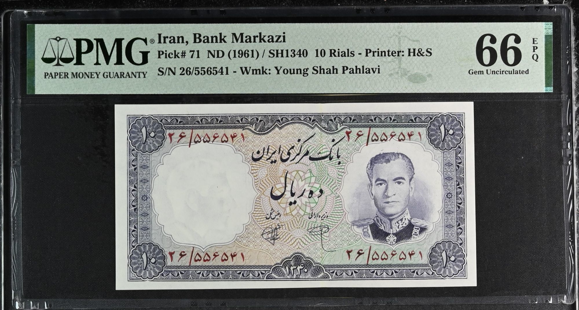 Fifth portrait of Mohammad Reza Shah Pahlavi in army uniform at right; geometric design at center.