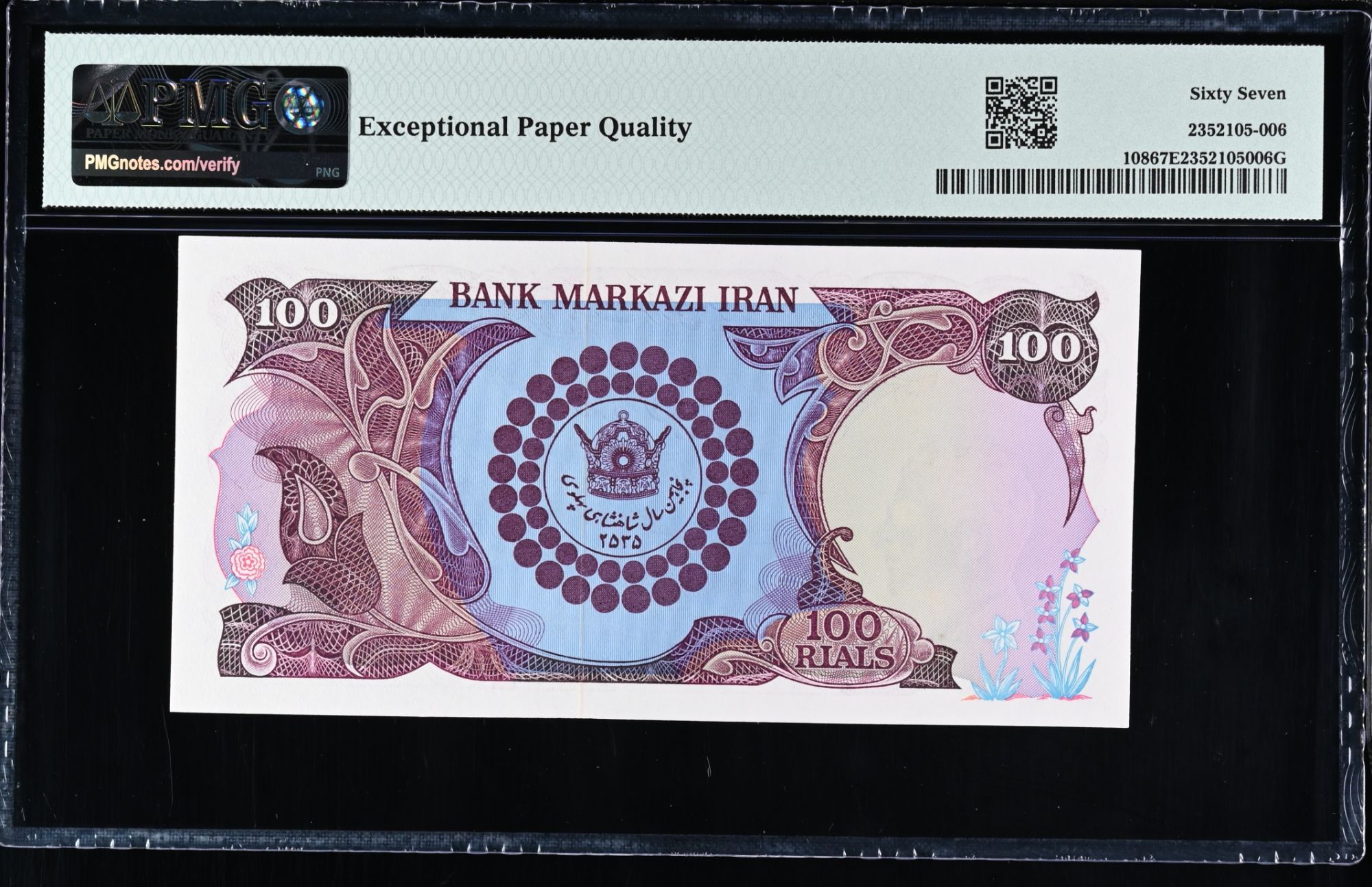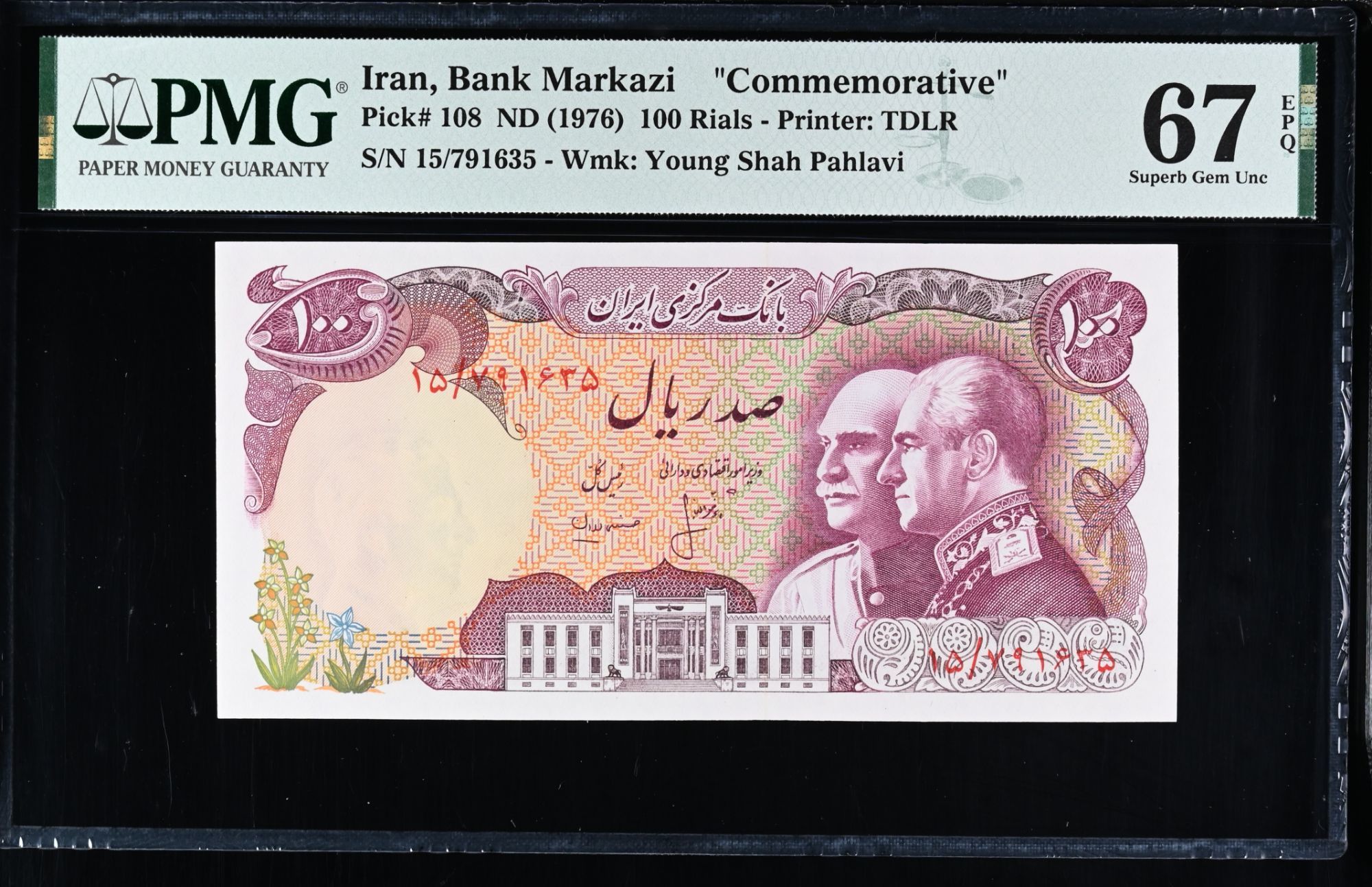 Translation:Â Persian carpet design with old Bank Melli at bottom centre. Portrait of Shah Pahlavi with Shah Reza at right.
