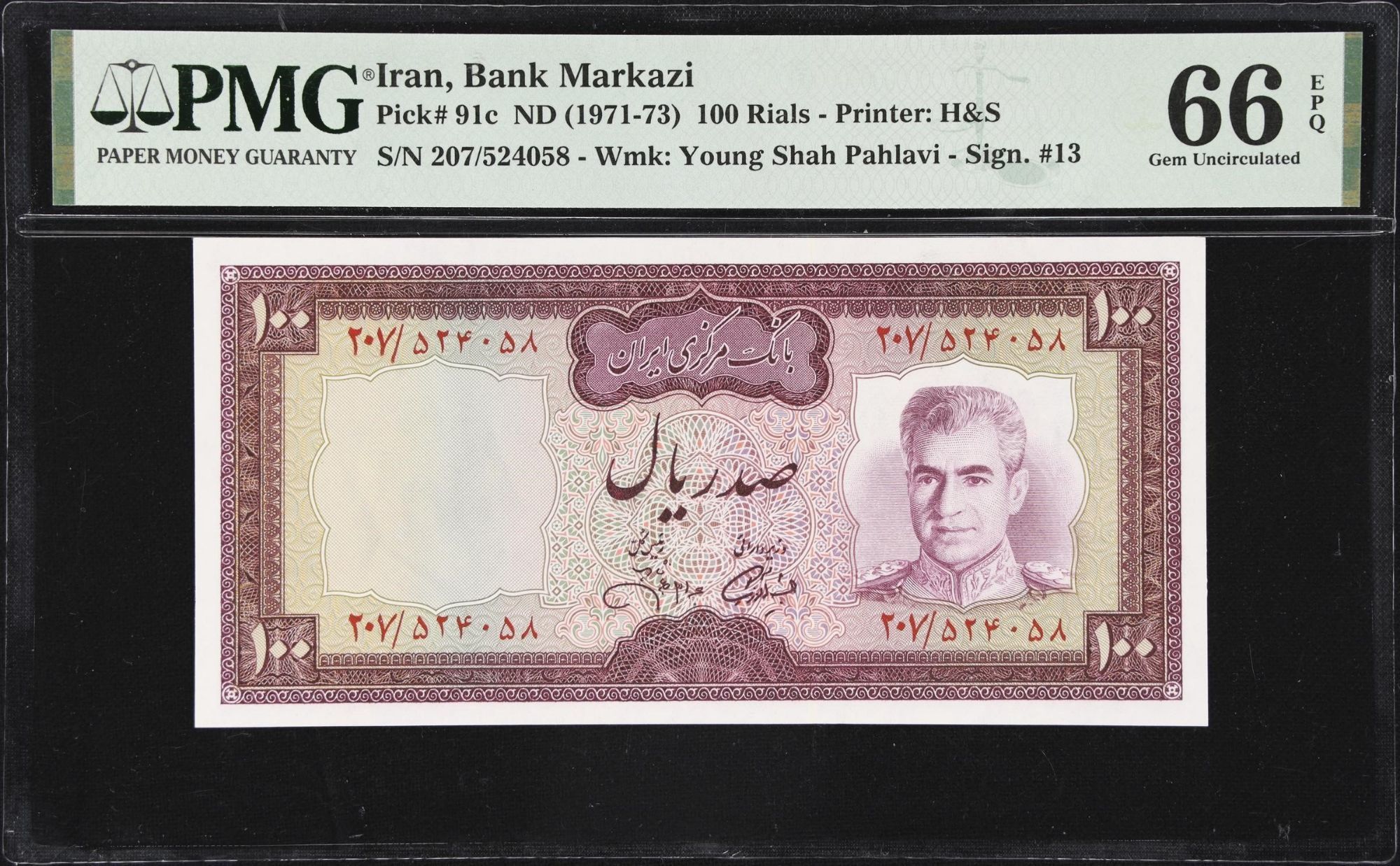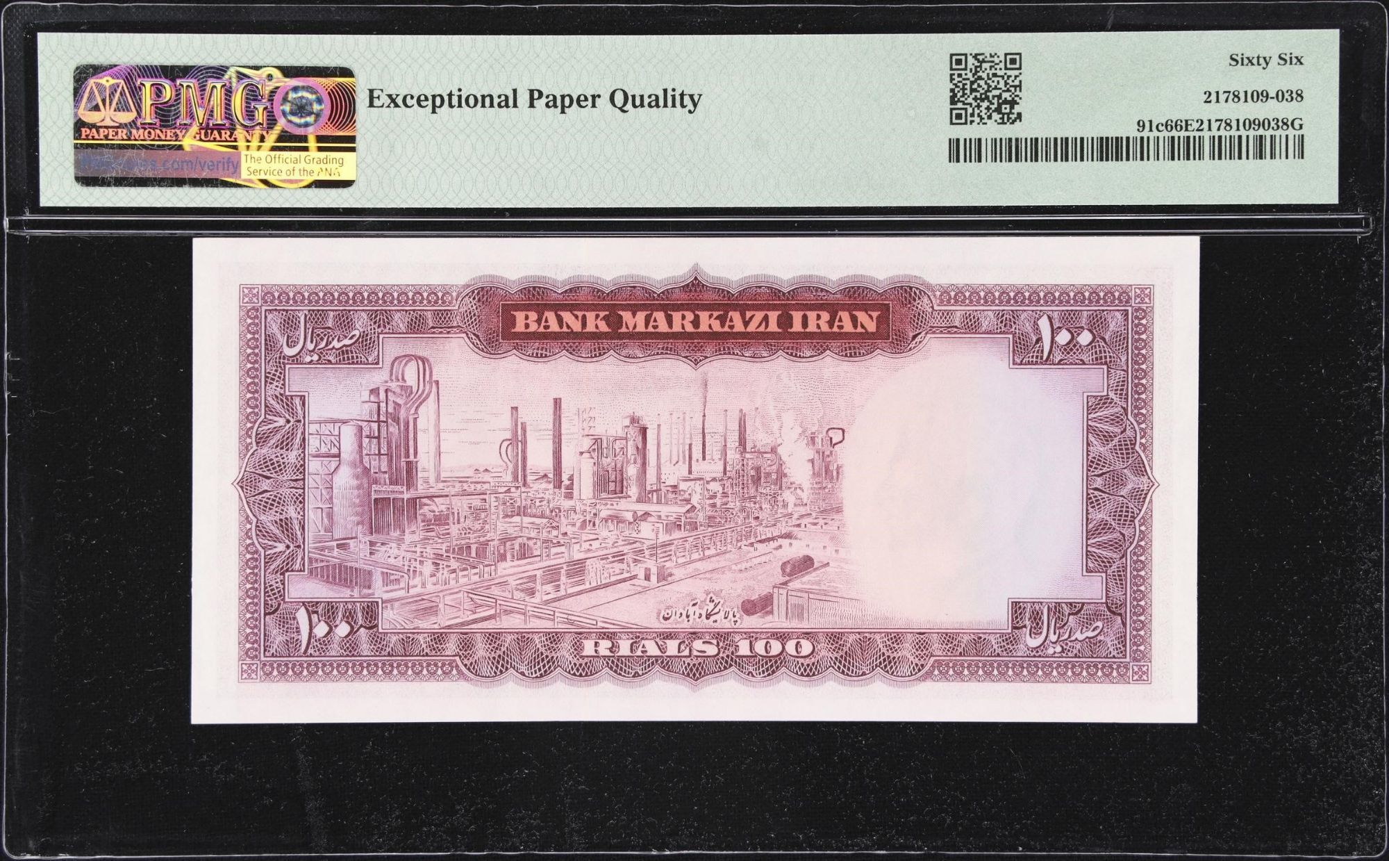 100 Rials Shah Pahlavi , Abadan Refinery,1971-73 SH , PMG 66 Gem UNC (060)