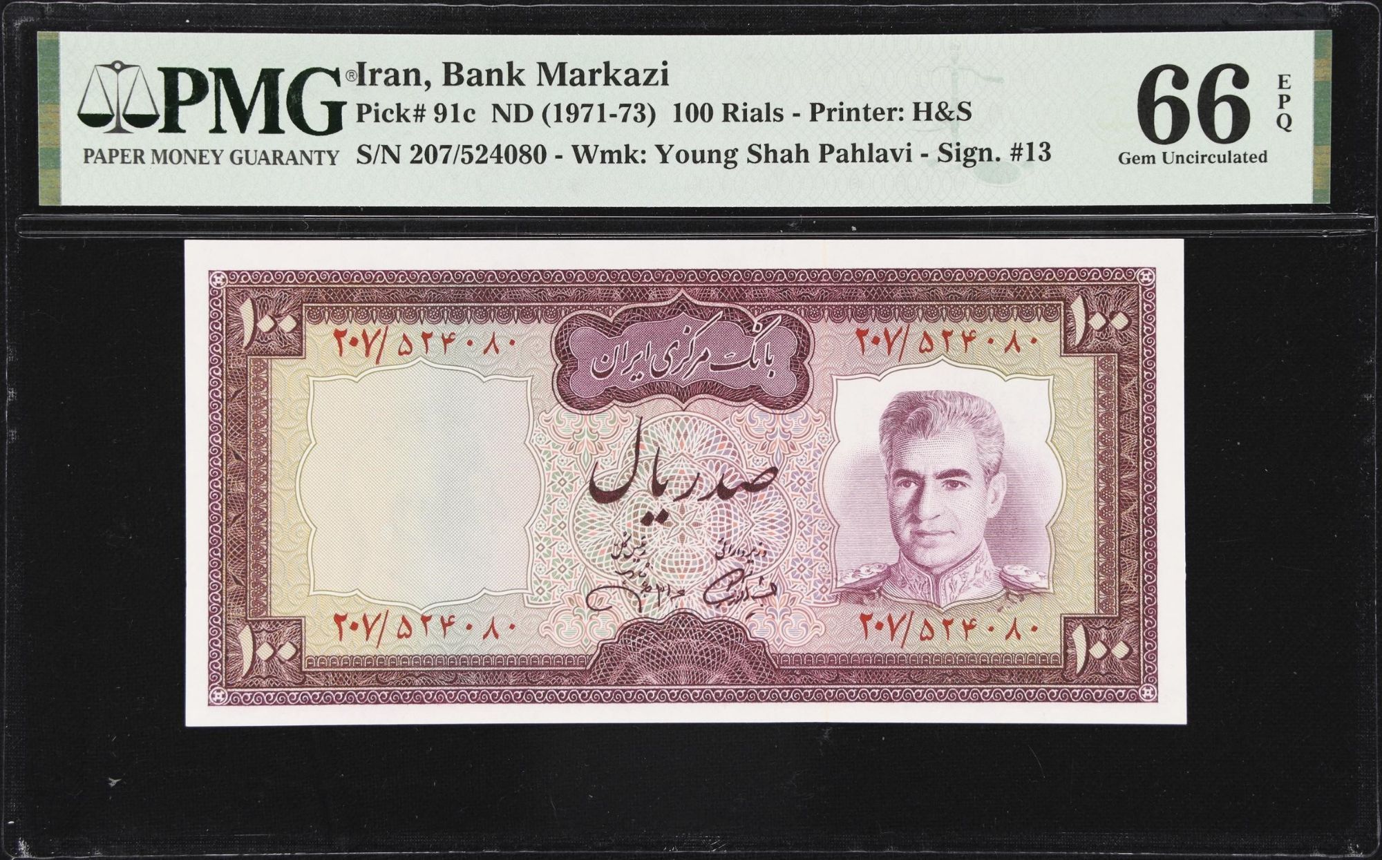 100 Rials Shah Pahlavi , Abadan Refinery,1971-73 SH , PMG 66 Gem UNC (080)