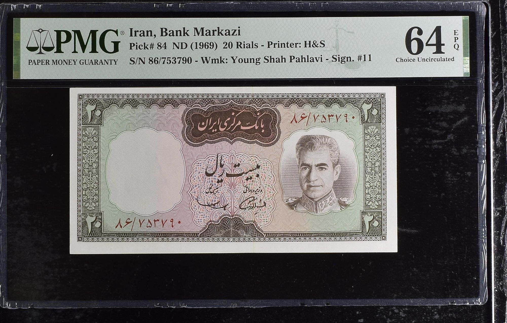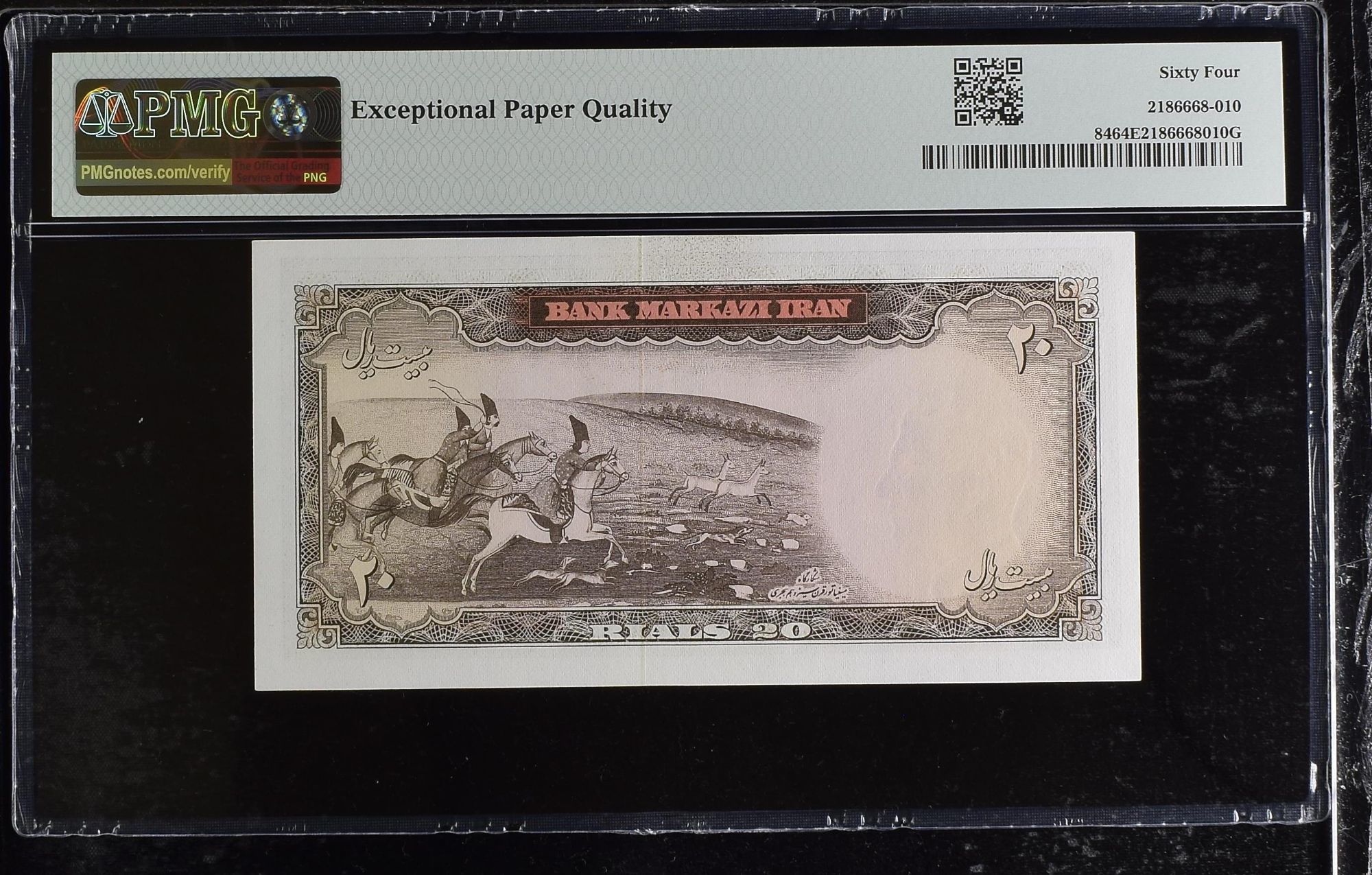 Seventh portrait of Mohammad Reza Shah Pahlavi in Army uniform at right; geometric design at center.