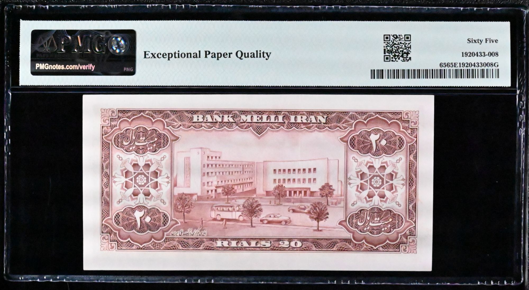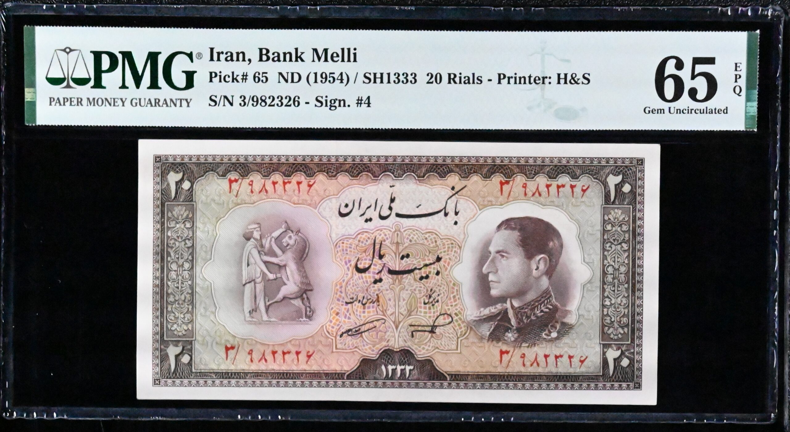 Fourth portrait of Mohammad Reza Shah Pahlavi in army uniform at right; stylized man slayed beast at left.