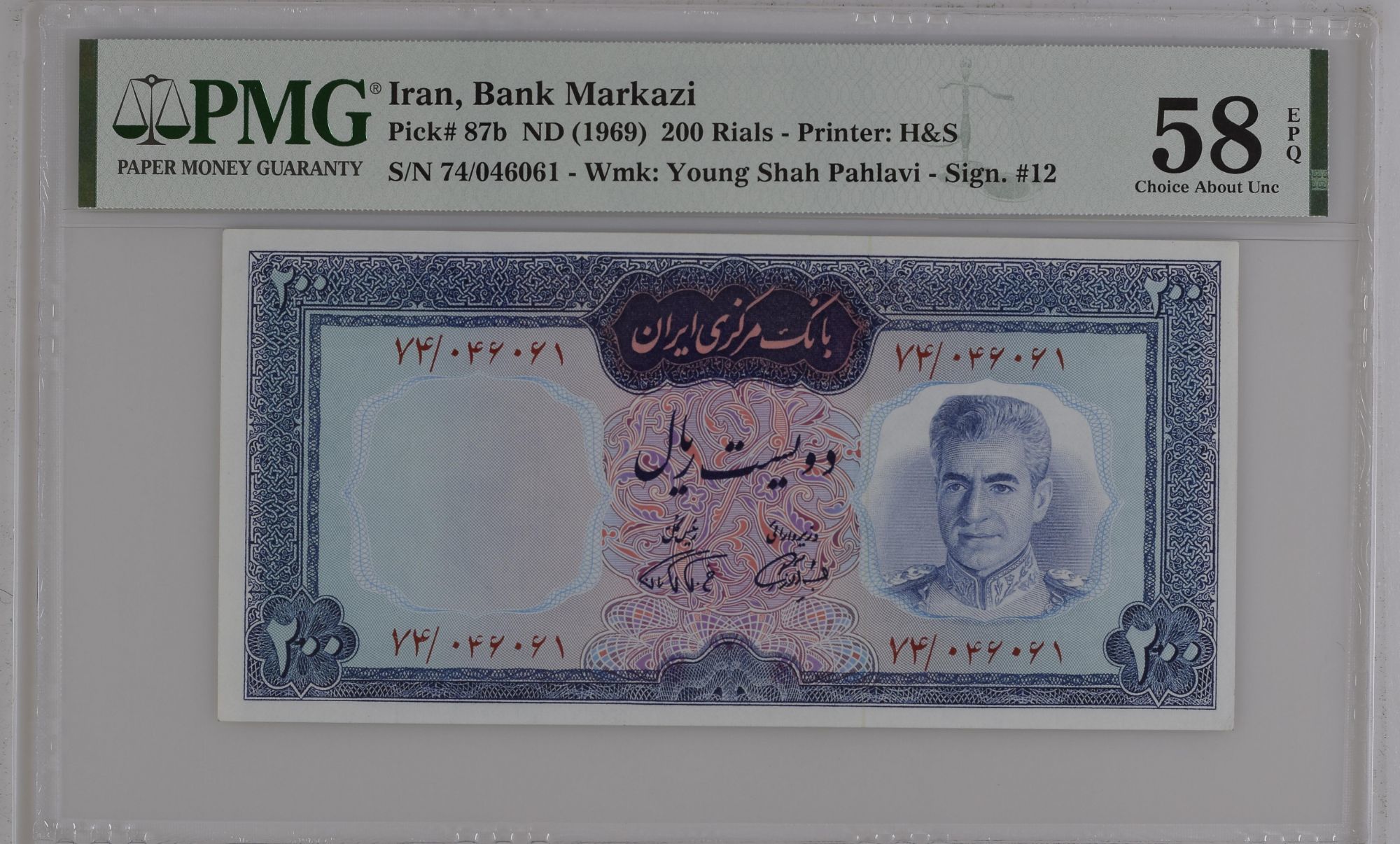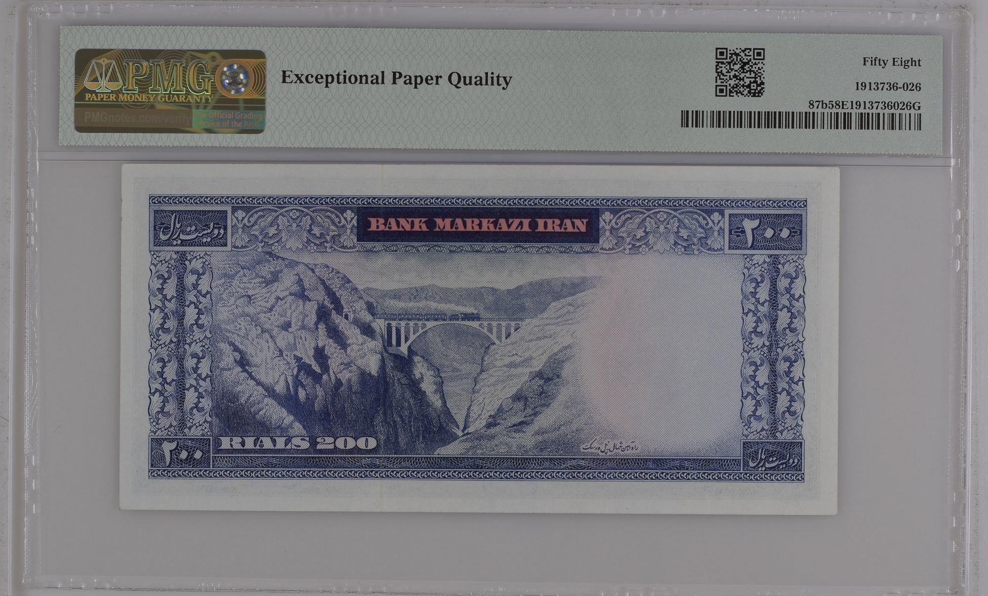Seventh portrait of Mohammad Reza Shah Pahlavi in Army uniform at right; geometric design at center.