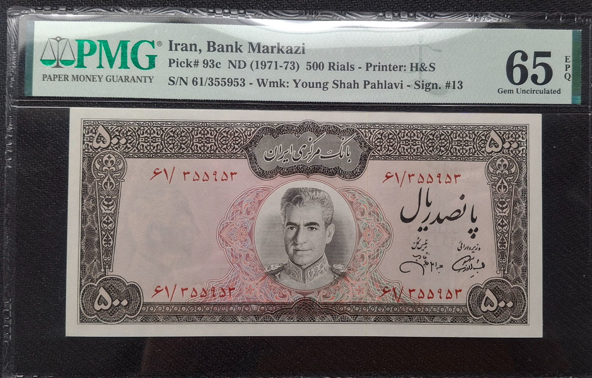500 Rials Young shah pahlavi (1971-73) PMG 65 Gem UNC -(953)