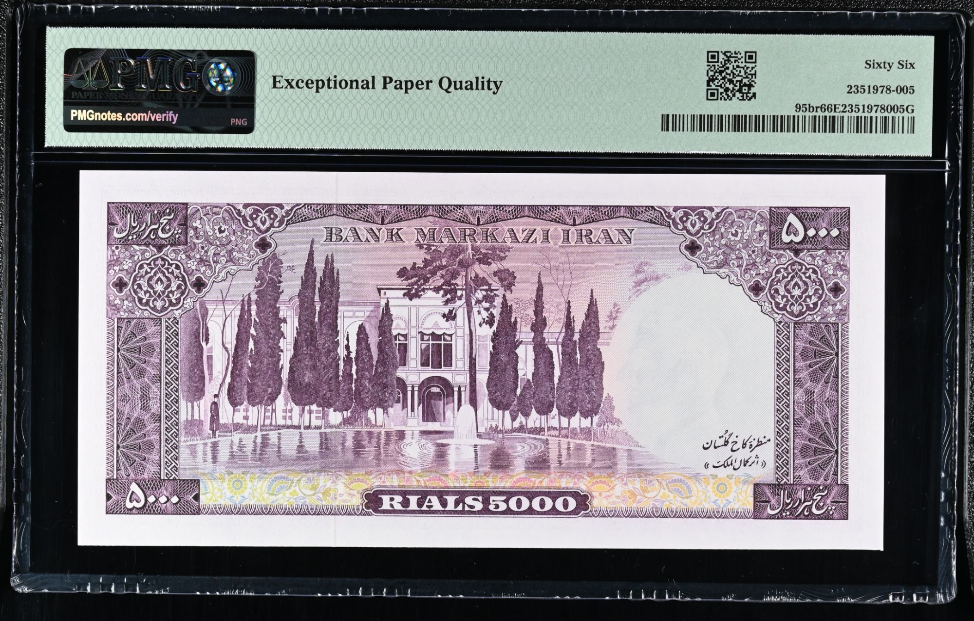 Obverse: Portrait of Mohammad Reza Shah Pahlavi wearing royal uniform. script: Bank-e- Markazie-e- Iran’ (Central Bank of Iran), ‘Paj hezar Rial’ ( Five thousand Rials),